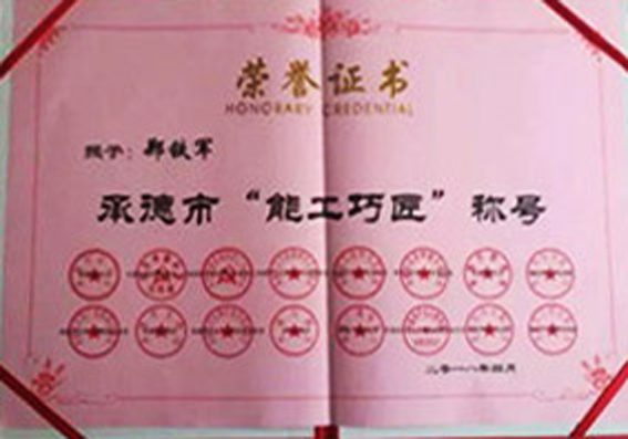 鄭氏砂藝創(chuàng)始人鄭鐵軍,2011年以來,先后獲得 “河北省2010年度民間工藝美術(shù)大師”、“河北省外出務(wù)工致富能手”、 “首屆河北省五大民俗企業(yè)家”、“河北省企業(yè)誠信建設(shè)優(yōu)秀工作者” 、首屆燕趙“文化之星”、“2016-承德市十大行業(yè)領(lǐng)軍人物”、“美麗河北·優(yōu)秀文化能人” 、“承德市拔尖人才”、 “承德市能工巧匠”等榮譽(yù)稱號(hào)。