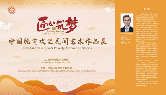 由中國人民對外友好協(xié)會主辦的“匠心筑夢—中國脫貧攻堅民間藝術作品展”于10月24日(聯(lián)合國日)正式開幕。中國人民對外友好協(xié)會會長林松添大使題寫前言,聯(lián)合國代理駐華協(xié)調(diào)員桑愛玲女士向展覽發(fā)來賀詞。