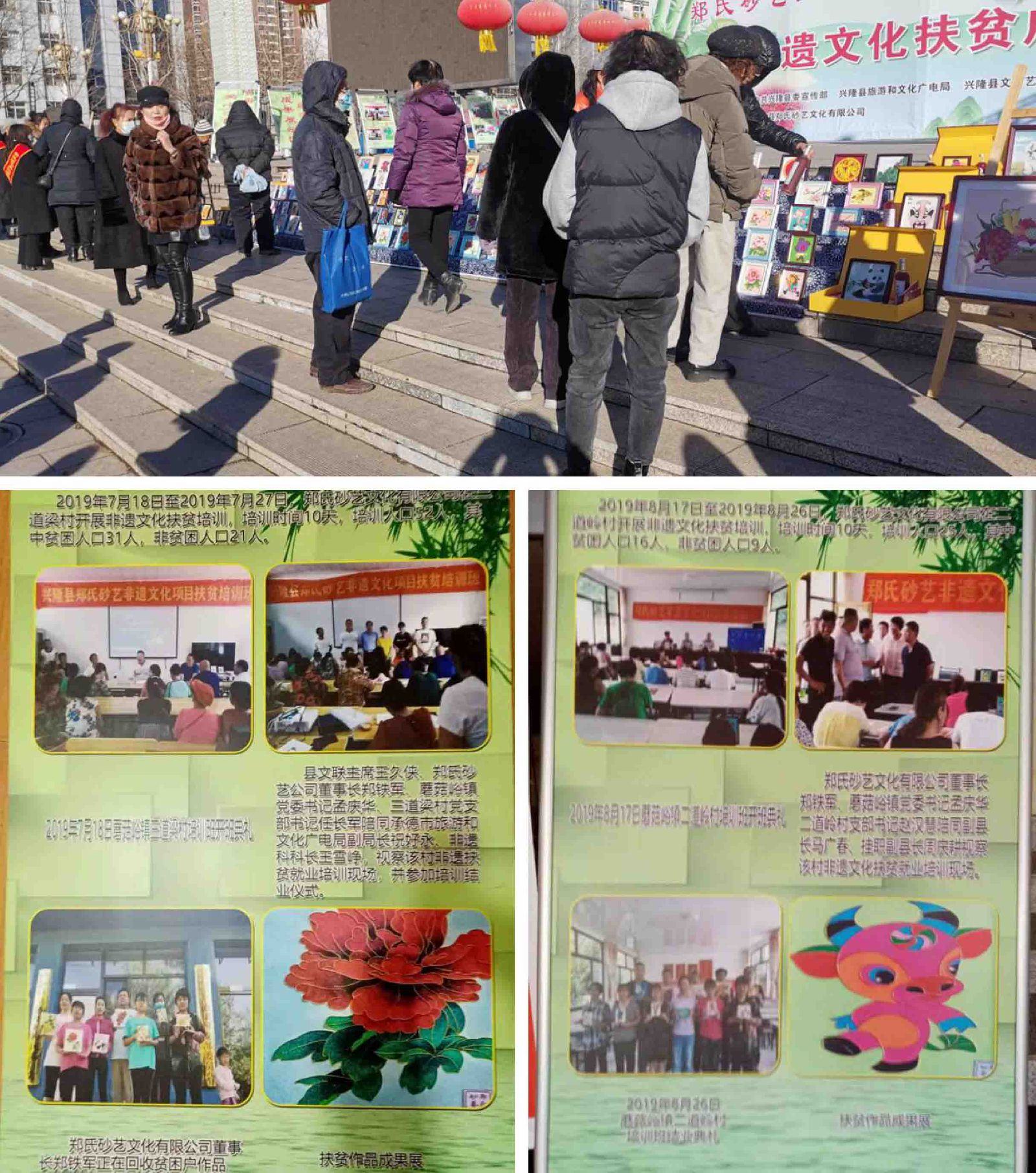 2020年11月27日。由中共興隆縣委宣傳部、興隆縣旅游和文化廣電局、興隆縣文學藝術界聯(lián)合會、興隆縣扶貧開發(fā)辦公室主辦的、由興隆縣鄭氏砂藝文化有限公司承辦的《非遺文化扶貧成果展》在興隆縣中心廣場拉開帷幕。展會由興隆縣文學藝術界聯(lián)合會主席王久俠主持,鄭氏砂藝文化 有限公司董事長鄭鐵軍致開幕詞。文聯(lián)主席王久俠作重要講話。她說:“鄭氏砂藝是祖?zhèn)骷妓?,幾年來鄭氏砂藝積極開展非遺文化扶貧,培訓全縣400余名貧困婦女,制作出了具有飽含鄉(xiāng)土氣息,美輪美奐的砂藝作品。讓他們用巧手脫貧致富,為脫貧攻堅作出顯著貢獻?!彪S后縣委宣傳部常務副部長隋云鵬、縣旅游和文化廣電局黨委書記閆海濤、文聯(lián)主席王久俠由砂藝公司董事長鄭鐵軍、公司工會主席趙文紅等引導下,觀摩了“扶貧培訓成果展區(qū)”、“消費扶貧展區(qū)”、“貧困戶作品展區(qū)”及“愛心認購展區(qū)”。四區(qū)展介及作品。對鄭氏砂藝非遺文化扶貧成果給予充分肯定,并興致勃勃地欣賞了鄭氏砂藝美輪美奐的貧困戶作品。