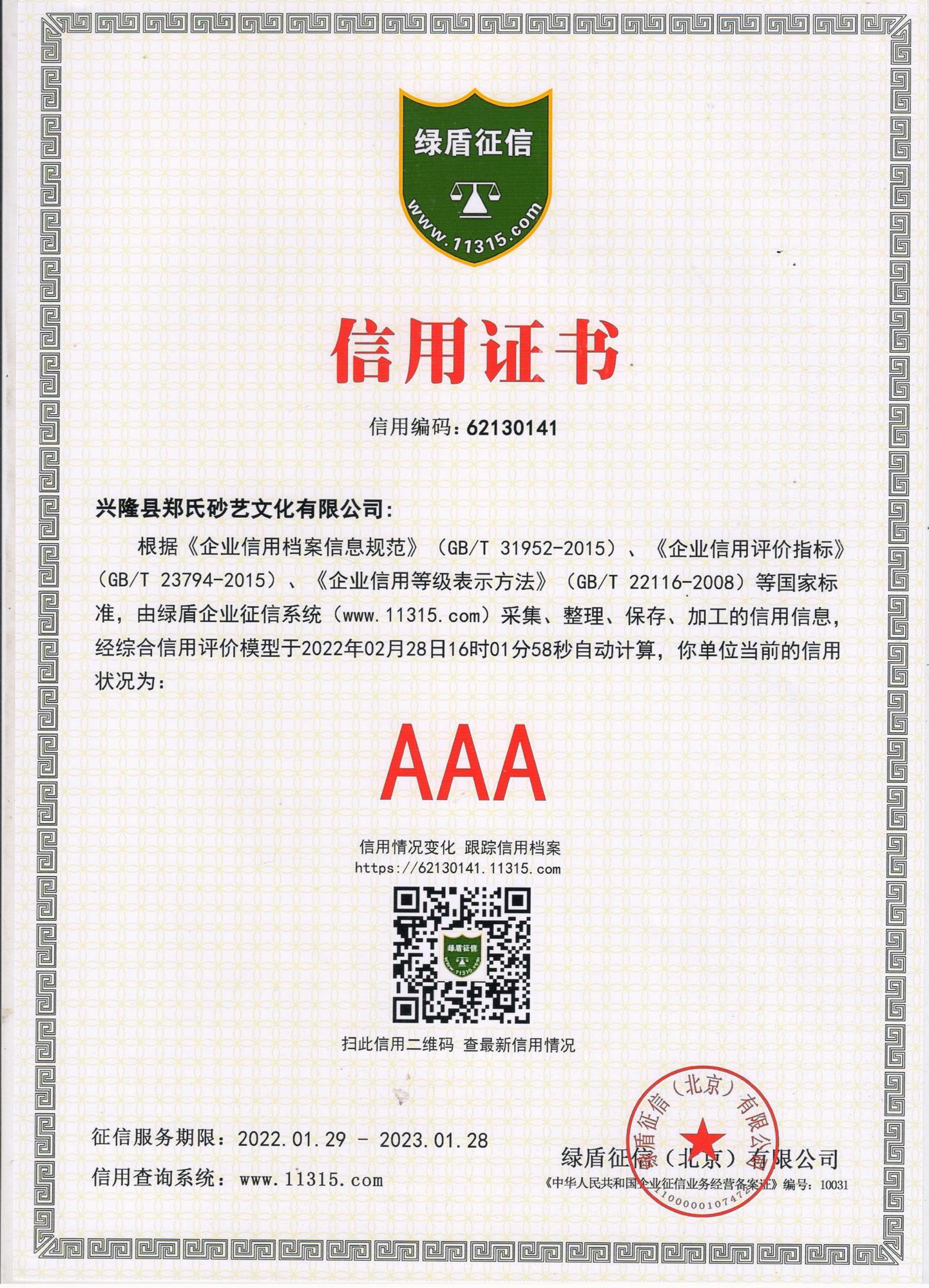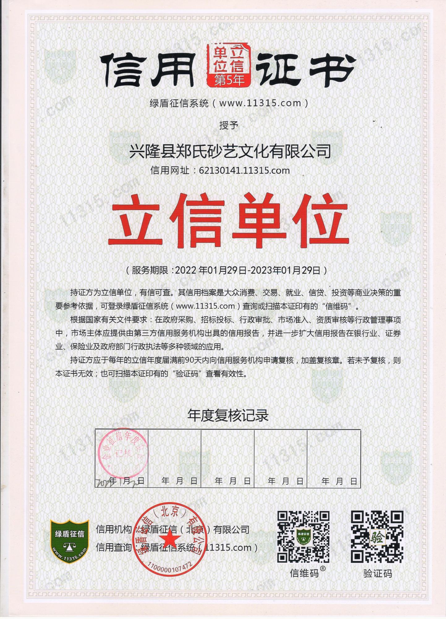 2022年,根據(jù)綠盾企業(yè)征信系統(tǒng)(www.11315.com)采集、整理、保存、加工的信息,經(jīng)綜合信用評價模型自動評估,興隆縣鄭氏砂藝文化有限公司被評為AAA級信用企業(yè),并授予綠盾征信“信用證書”,企業(yè)已連續(xù)五年獲此殊榮。