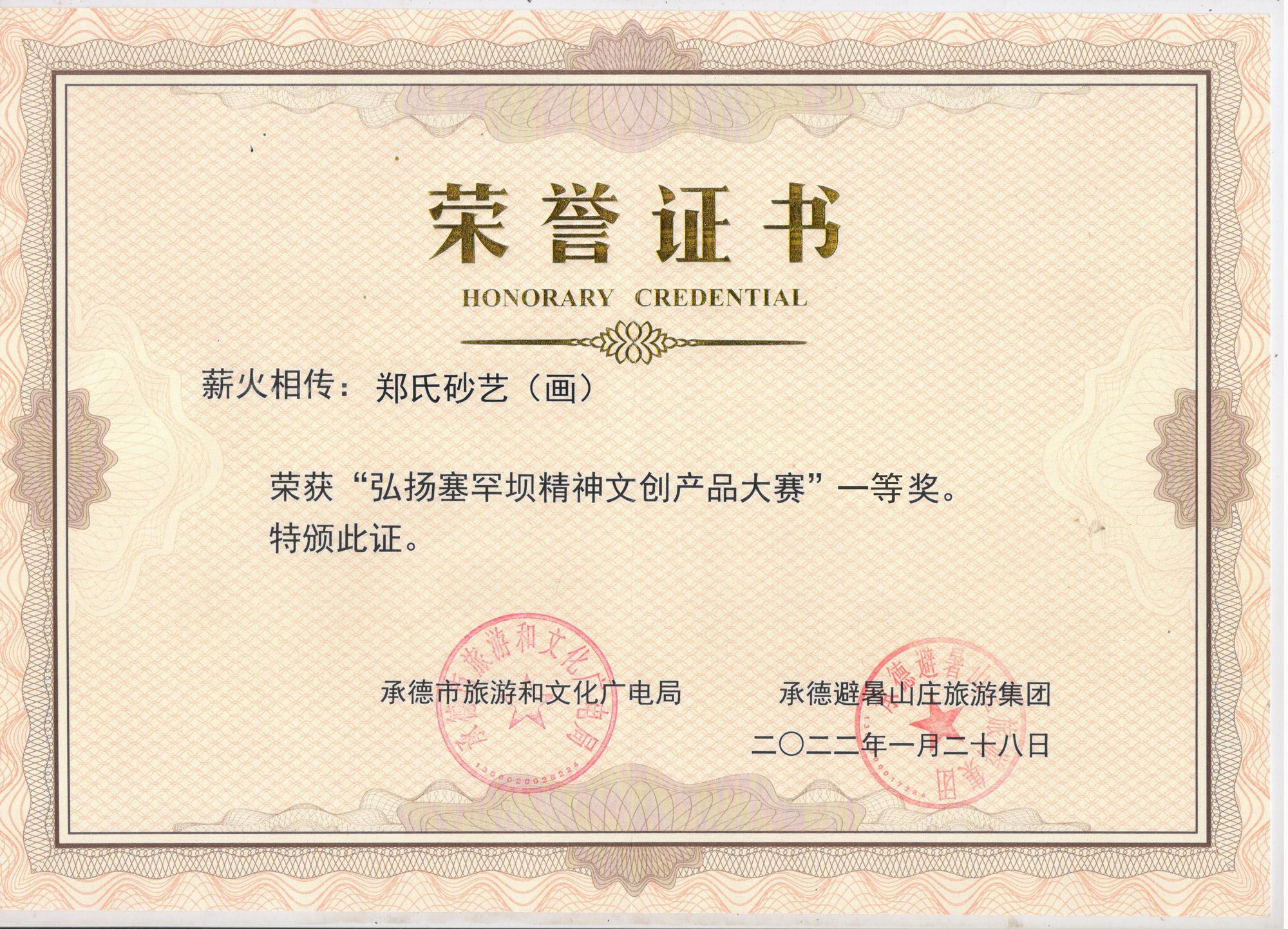 近期,鄭氏砂藝多次應(yīng)邀參加了省、市相關(guān)單位舉辦的各項(xiàng)展出活動,參展的非遺砂畫作品和研發(fā)的旅游商品得到了社會各界人士的一致好評,被活動組委會給予了很大的肯定,在一定程度上提高了我縣和“非遺”文化鄭氏砂藝的知名度。2021年12月,鄭鐵軍董事長的砂畫作品《長城萬里》入選“多彩非遺 壯美長城”河北省非遺作品主題展,并在河北省“非遺”保護(hù)中心展出。2022年1月,鄭氏砂藝砂畫作品《薪火相傳》榮獲“弘揚(yáng)塞罕壩精神文創(chuàng)產(chǎn)品大賽”一等獎。2022年1月,鄭氏砂藝多項(xiàng)作品在承德市旅游協(xié)會舉辦的“傳承非遺手工技藝、助力鄉(xiāng)村振興”活動榮獲獎項(xiàng)。2022年2月,鄭氏砂藝董事長鄭鐵軍在全市開展的“鄉(xiāng)村振興黨旗紅 文藝創(chuàng)新樹先鋒”活動中表現(xiàn)突出,榮獲“承德市2021年度優(yōu)秀鄉(xiāng)村文藝家會員”稱號。