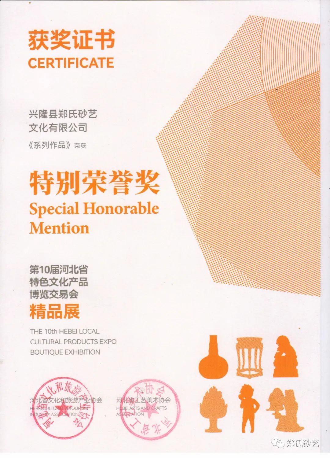 近日,由河北省文化和旅游產(chǎn)業(yè)協(xié)會、河北省工藝美術(shù)協(xié)會聯(lián)合舉辦的“第十屆河北省特色文化產(chǎn)品博覽交易會精品展”在石家莊舉行,鄭氏砂藝應(yīng)邀參加了此次活動,其中鄭氏砂藝砂畫作品《紅紅火火》、《中國夢》等系列作品榮獲了第十屆河北省特色文化產(chǎn)品博覽交易會“特別榮譽獎”。