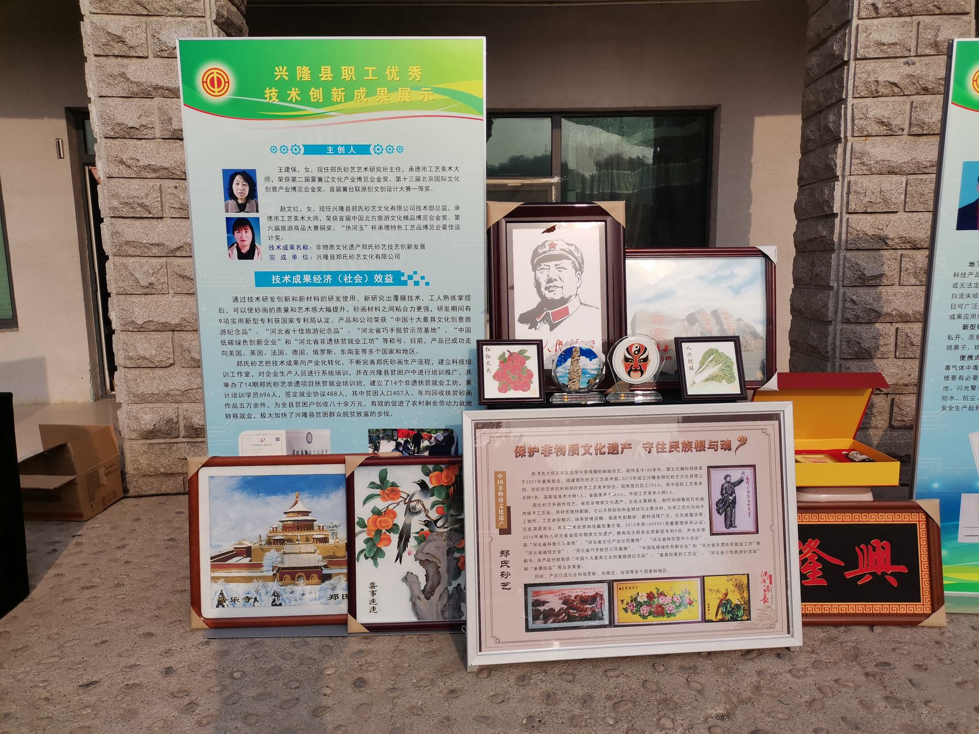 2022年4月26日上午,由承德市總工會(huì)組織的“2022年承德市職工優(yōu)秀技術(shù)創(chuàng)新成果展”在承德市勞動(dòng)公園盛大舉行,出席此次活動(dòng)的主要市領(lǐng)導(dǎo)有承德市市委書記柴寶良、市長王亞軍、市委副書記郭旭濤、市人大常委會(huì)黨組書記、主任劉文勤、市政協(xié)黨組書記、主席吳清海、市總工會(huì)主席關(guān)繼高、市總工會(huì)黨組書記常務(wù)副主席侯國天、市總工會(huì)二級(jí)調(diào)研員司志通等市總領(lǐng)導(dǎo)。興隆縣出席此次活動(dòng)的主要領(lǐng)導(dǎo)有縣委副書記孫常君、縣人大常委會(huì)黨組副書記、總工會(huì)黨組書記、主席王立群、縣總工會(huì)常務(wù)主席司志允、縣總工會(huì)副主席姜存衛(wèi)和部室負(fù)責(zé)人管宏艷,活動(dòng)主要展示近年來全市職工群眾性技術(shù)創(chuàng)新活動(dòng)取得的優(yōu)秀技術(shù)創(chuàng)新成果。經(jīng)市總初選鄭氏砂藝參加了此次活動(dòng),執(zhí)行董事鄭鐵軍攜職工王建保、趙文紅的創(chuàng)新成果“非物質(zhì)文化遺產(chǎn)鄭氏砂藝技藝創(chuàng)新發(fā)展”入選展示,鄭氏砂藝展示的覆膜砂畫、御用頸枕、水晶砂畫等系列創(chuàng)新作品受到市縣各級(jí)領(lǐng)導(dǎo)的一致青睞和好評(píng)。
