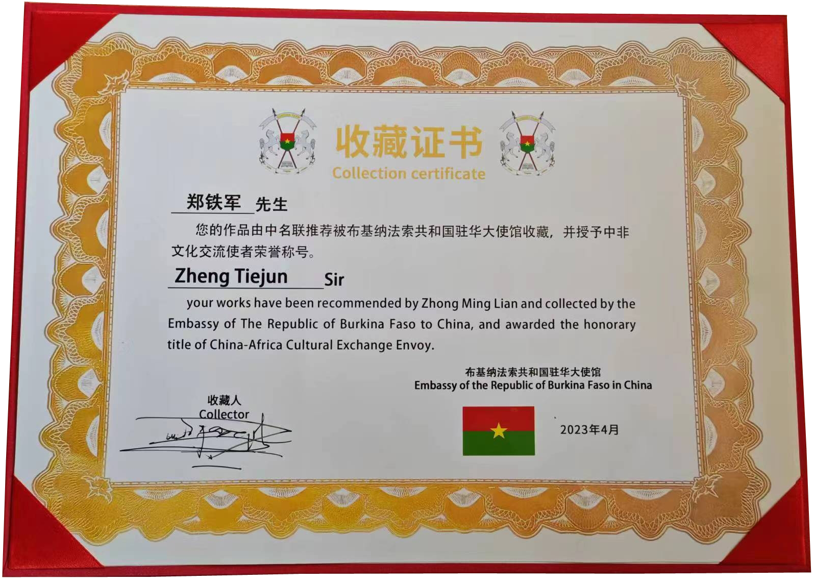 鄭鐵軍先生的作品曾多次參加國內(nèi)大型會(huì)展,并被多家展館收藏。2023年4月,其作品再次被布基納法索共和國駐華大使館收藏并頒發(fā)證書,并被作為國禮收藏,為兩國友好合作的美好愿望添磚加瓦。
