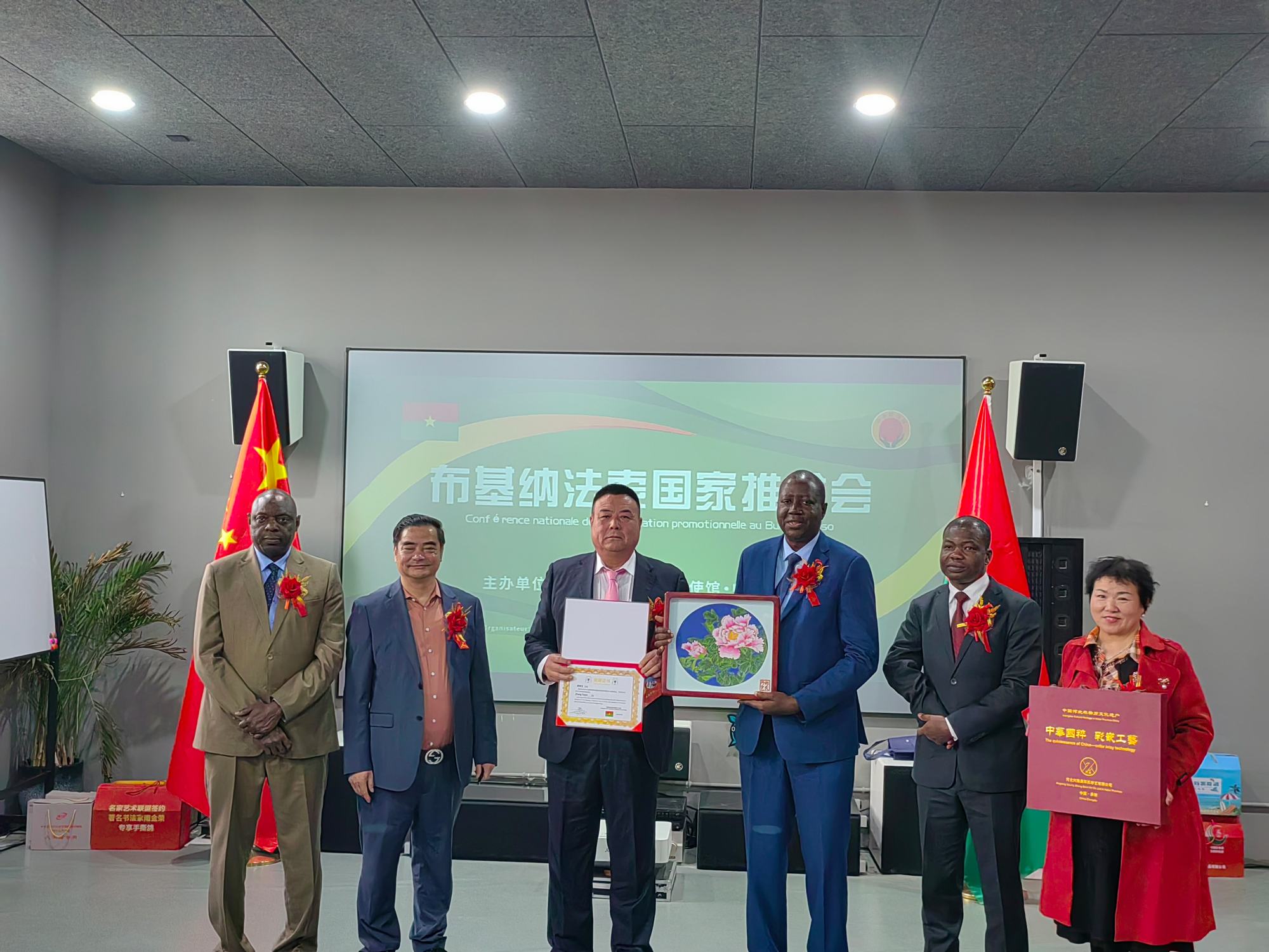 2023年4月12日,興隆縣鄭氏砂藝文化有限公司執(zhí)行董事長鄭鐵軍參加由布基納法索駐華大使館.中名聯(lián)書畫培訓(xùn)國際交流部主辦的“布基納法索國家推介會(huì)”和“中名聯(lián)191期經(jīng)濟(jì)與藝術(shù)交流會(huì)”。會(huì)上,布基納法索共和國駐華大使團(tuán)、商務(wù)代表團(tuán)一行對鄭鐵軍的砂畫作品高度贊賞,并現(xiàn)場簽訂了訂購協(xié)議,頒發(fā)了收藏證書,授予鄭鐵軍“中非文化交流使者”榮譽(yù)稱號。