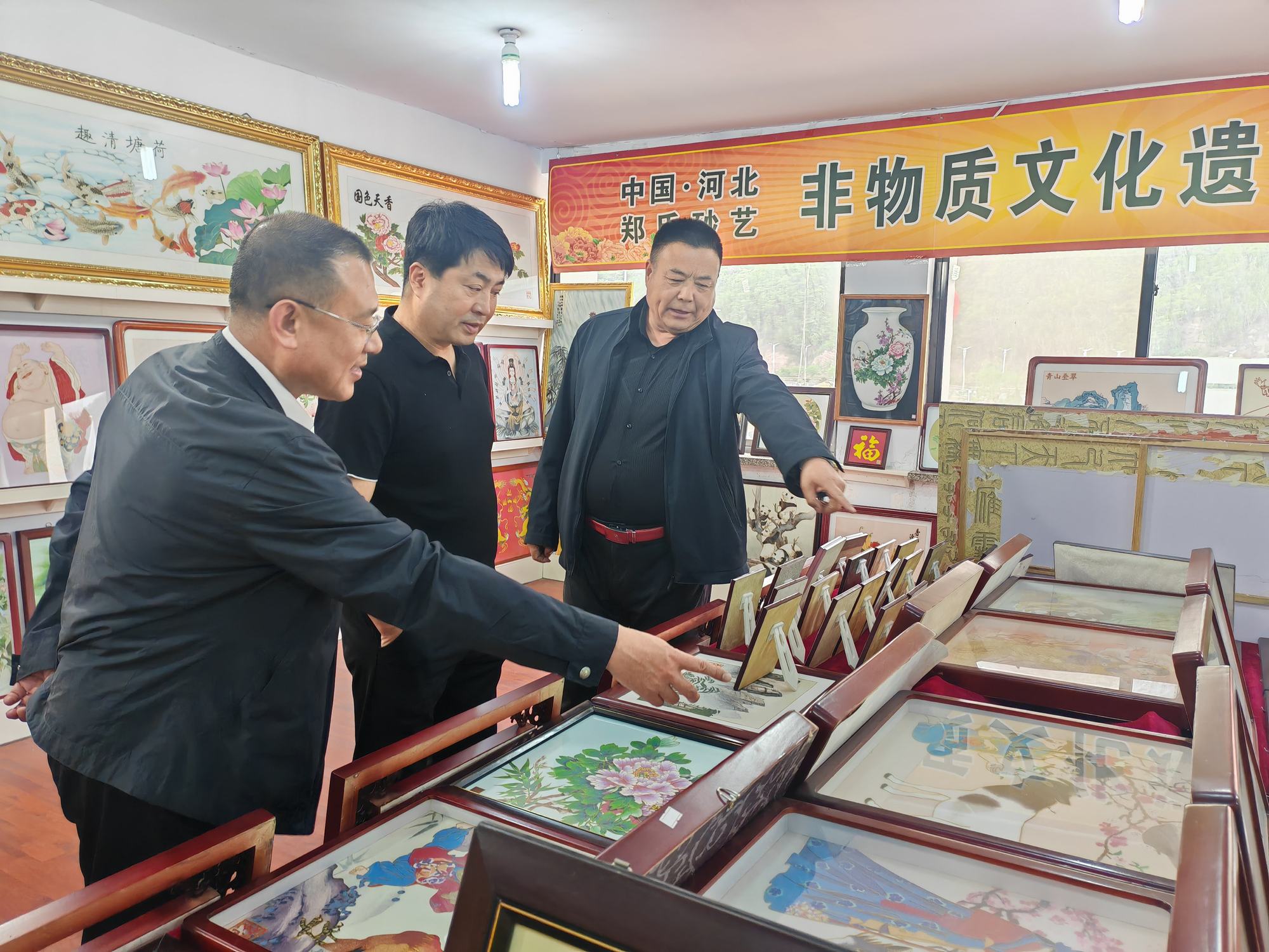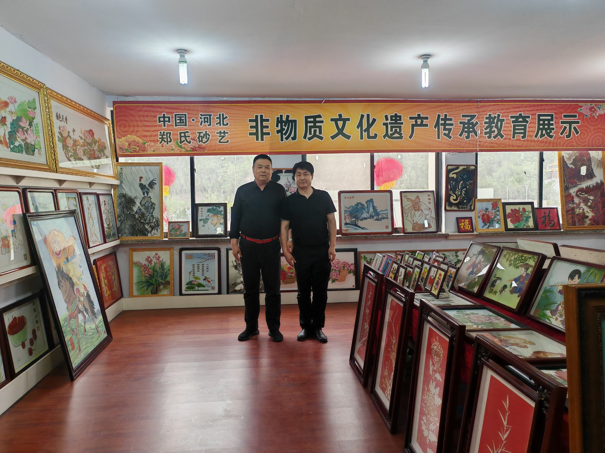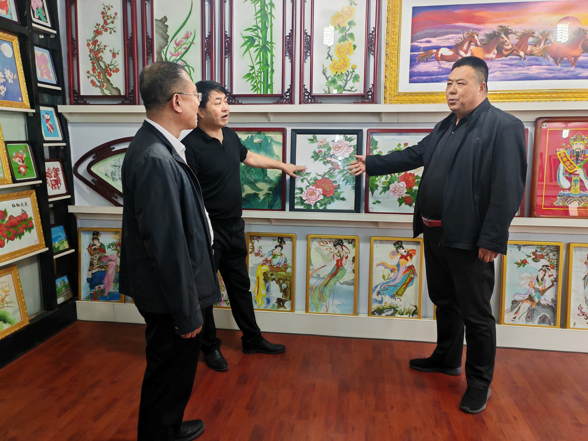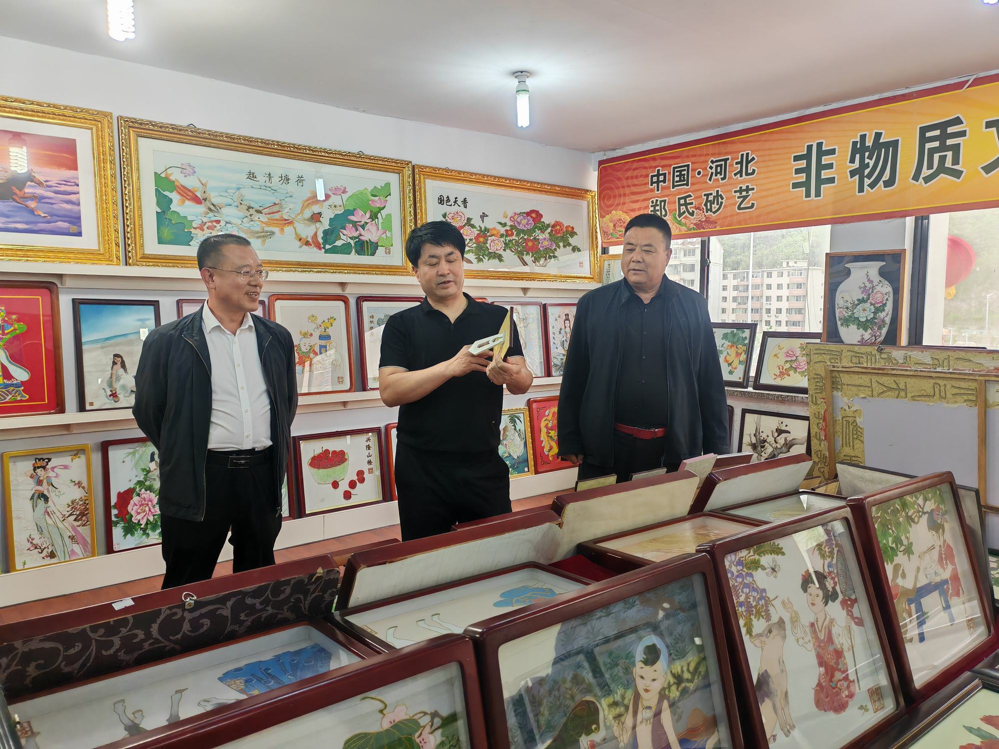 程志忠書記等一行在鄭氏砂藝董事長鄭鐵軍的陪同下,參觀了鄭氏砂藝非遺文化展館,了解了鄭氏砂藝非遺文化的傳承和發(fā)展。隨后,實地觀察了鄭氏砂藝(畫)的制作過程,并與砂藝技師們進(jìn)行了交流,了解了砂畫制作原料和技藝手法。