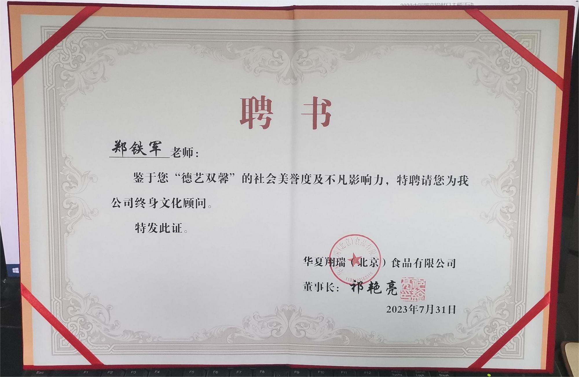 2023年7月31日,鄭鐵軍老師砂畫作品《牡丹》被華夏翔瑞(北京)食品有限公司永久收藏,同時鄭鐵軍老師被該公司聘為終身文化顧問。