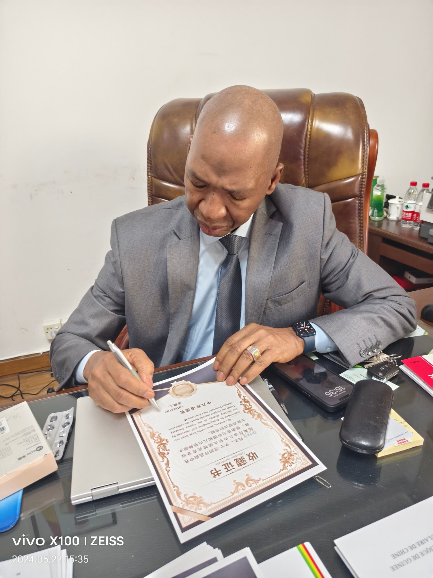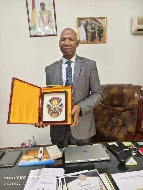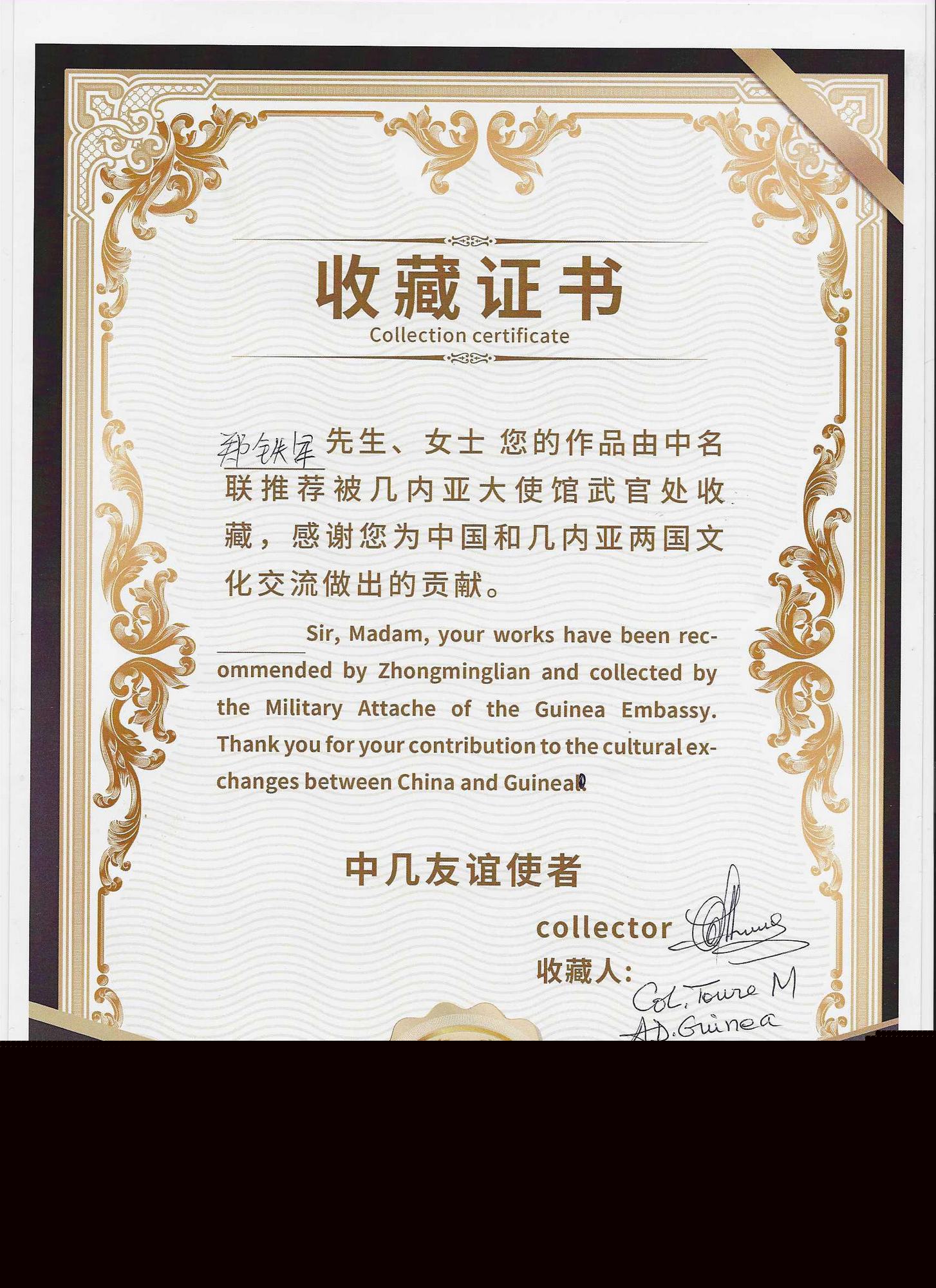 2024年5月22日,經(jīng)幾內(nèi)亞駐華大使誠(chéng)邀,中名聯(lián)推薦,中名聯(lián)簽約國(guó)禮藝術(shù)家鄭鐵軍的砂畫(huà)系列作品走進(jìn)幾內(nèi)亞共和國(guó)駐華大使館,其中砂畫(huà)作品《臉譜》被幾內(nèi)亞駐華大使館作為國(guó)禮珍藏,并授予鄭鐵軍中幾文化交流使者榮譽(yù)稱(chēng)號(hào)。