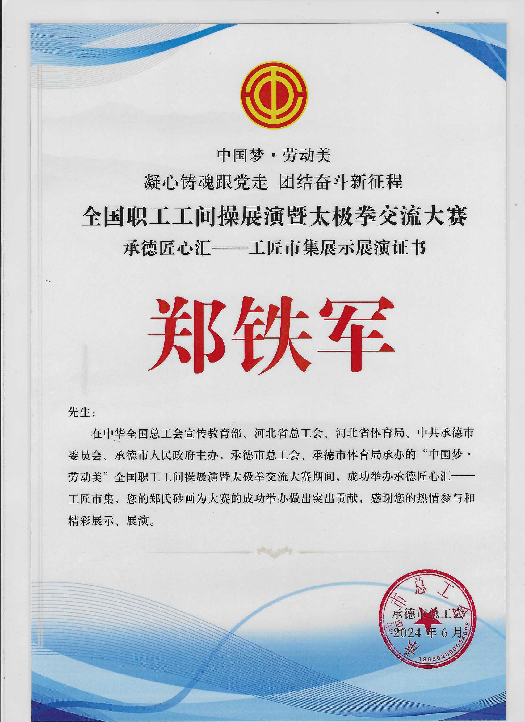 2024年6月4日,由全國(guó)總工會(huì)宣傳教育部、河北省總工會(huì)、河北省體育局、承德市委市政府聯(lián)合舉辦的“中國(guó)夢(mèng)·勞動(dòng)美——凝心鑄魂跟黨走 團(tuán)結(jié)奮斗新征程”全國(guó)職工工間操展演暨太極拳交流大賽活動(dòng)在承德市奧體中心開幕。本次大賽為期三天,包括工間操展演大賽、太極拳交流大賽、健步走大賽,共有來(lái)自各省、自治區(qū)、直轄市,各全國(guó)產(chǎn)業(yè)工會(huì)、中央和國(guó)家機(jī)關(guān)工會(huì)聯(lián)合會(huì)的36支參賽隊(duì)600余名職工參賽。