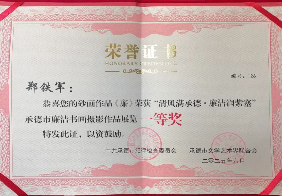 近日,“清風(fēng)滿承德·廉潔潤紫塞”承德市廉潔書畫攝影作品展覽評選結(jié)果揭曉,砂藝創(chuàng)作者鄭鐵軍的作品《廉》榮獲一等獎。該獎項(xiàng)由中共承德市紀(jì)律檢查委員會、承德市文學(xué)藝術(shù)界聯(lián)合會聯(lián)合頒發(fā)。
