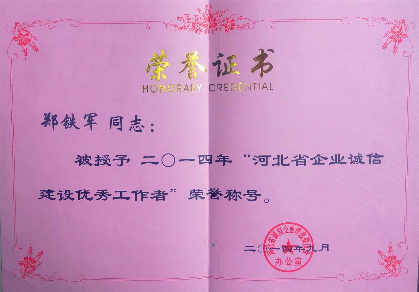 9月26日,河北省誠信企業(yè)評選委員會辦公室和河北省企業(yè)家協(xié)會同省有關部門通報表彰“河北省誠信企業(yè)”及“河北省企業(yè)誠信建設優(yōu)秀工作者”。興隆縣鄭氏砂藝有限公司榮獲“河北省誠信企業(yè)”榮譽稱號;公司總經理鄭鐵軍被授予“河北省誠信企業(yè)建設優(yōu)秀工作者”榮譽稱號。“河北省誠信企業(yè)”及“河北省企業(yè)誠信建設優(yōu)秀工作者”評選活動每兩年組織開展一次。2014年,經過公司申報、基層相關部門審查推薦、省相關主管部門復審、評審專家委員會審核評選、社會公示等程序獲此稱號。這是公司首次獲此殊榮。