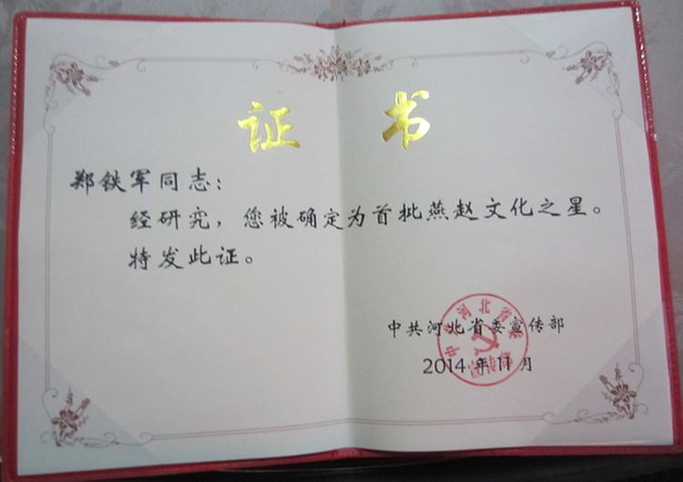 2014年11月,鄭鐵軍同志被省委宣傳部確定為《首屆河北省燕趙文化之星》。同時(shí)與他獲此殊榮的還有縣文化館副館長(zhǎng)錢(qián)飛龍同志。
