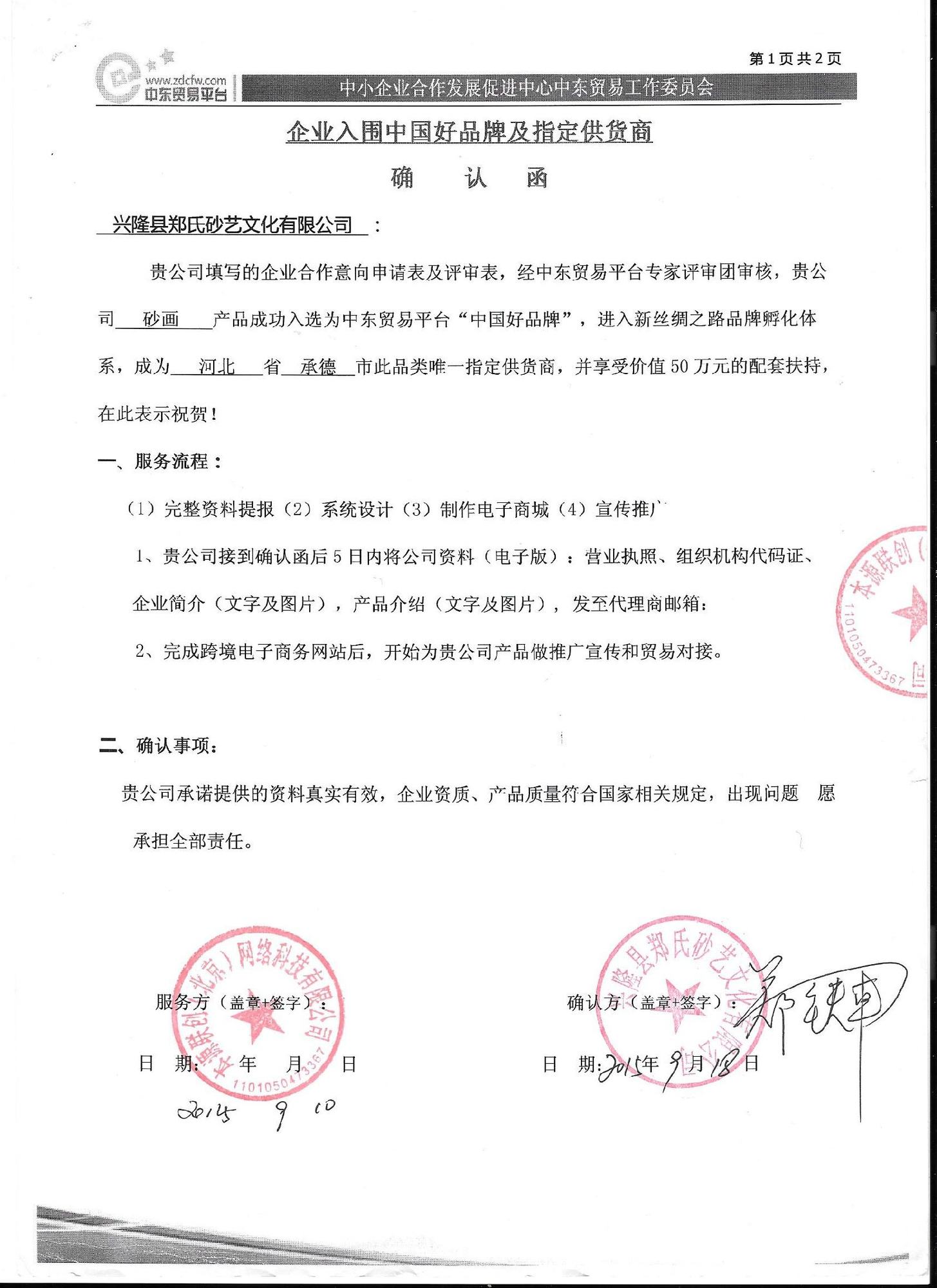 2015年9月10日,經(jīng)中東貿(mào)易平臺(tái)專家評(píng)審團(tuán)審核,本公司的砂畫產(chǎn)品成功入選為中東貿(mào)易平臺(tái)“中國(guó)好品牌”,進(jìn)入新絲綢之路品牌孵化體系,成為河北省承德市此品類唯一指定供貨商,并享受價(jià)值50萬(wàn)元的配套扶持。
