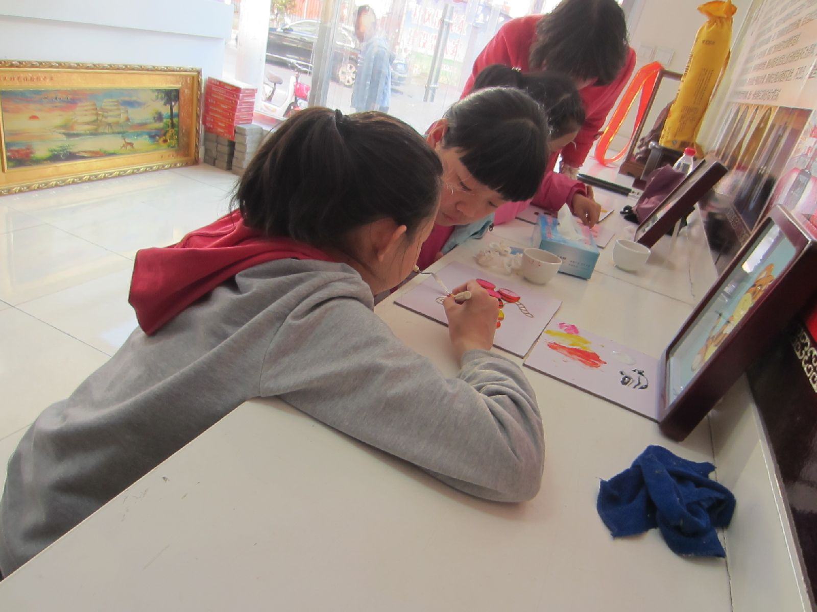 楊書(shū)記在體驗(yàn)館和員工交流、看小朋友制作砂畫(huà)