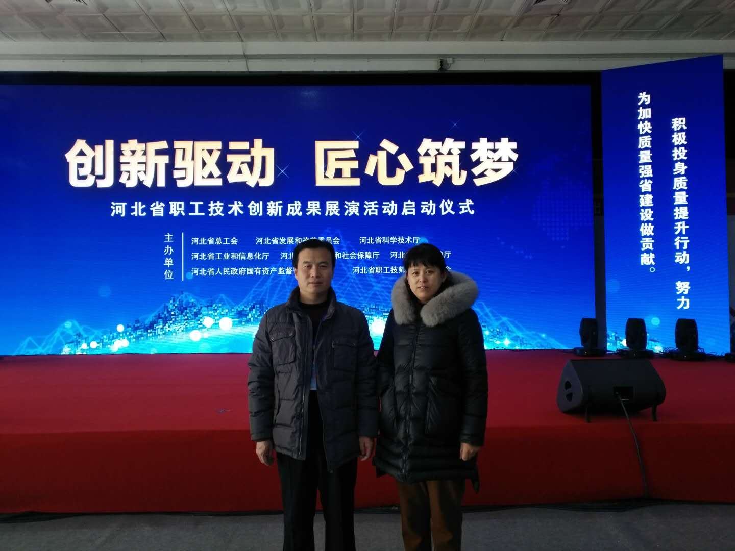 圖3:縣總工會(huì)副主席姜存衛(wèi)、鄭氏砂藝?yán)顣源航?jīng)理在“創(chuàng)新驅(qū)動(dòng).匠心筑夢(mèng)”活動(dòng)現(xiàn)場(chǎng)
