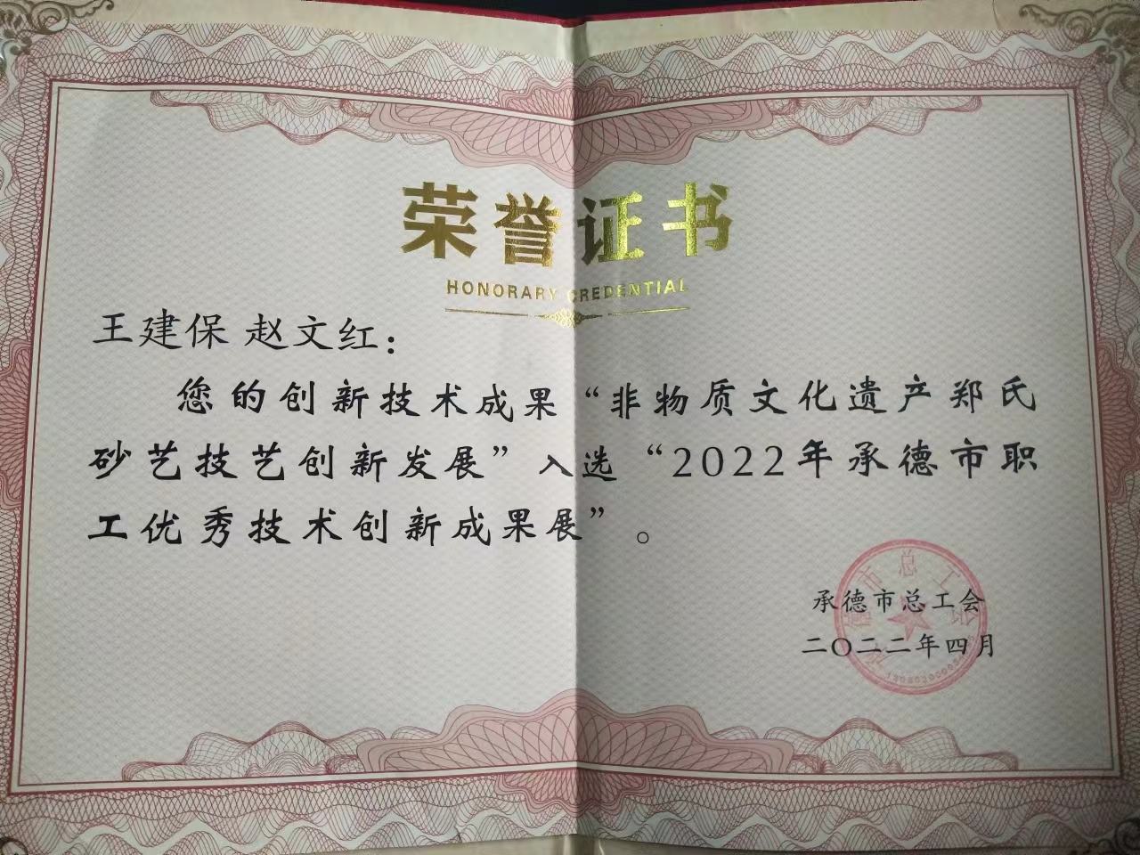 2022年4月26日上午,由承德市總工會(huì)組織的“2022年承德市職工優(yōu)秀技術(shù)創(chuàng)新成果展”在承德市勞動(dòng)公園盛大舉行,出席此次活動(dòng)的主要市領(lǐng)導(dǎo)有承德市市委書記柴寶良、市長王亞軍、市委副書記郭旭濤、市人大常委會(huì)黨組書記、主任劉文勤、市政協(xié)黨組書記、主席吳清海、市總工會(huì)主席關(guān)繼高、市總工會(huì)黨組書記常務(wù)副主席侯國天、市總工會(huì)二級(jí)調(diào)研員司志通等市總領(lǐng)導(dǎo)。興隆縣出席此次活動(dòng)的主要領(lǐng)導(dǎo)有縣委副書記孫常君、縣人大常委會(huì)黨組副書記、總工會(huì)黨組書記、主席王立群、縣總工會(huì)常務(wù)主席司志允、縣總工會(huì)副主席姜存衛(wèi)和部室負(fù)責(zé)人管宏艷,活動(dòng)主要展示近年來全市職工群眾性技術(shù)創(chuàng)新活動(dòng)取得的優(yōu)秀技術(shù)創(chuàng)新成果。經(jīng)市總初選鄭氏砂藝參加了此次活動(dòng),執(zhí)行董事鄭鐵軍攜職工王建保、趙文紅的創(chuàng)新成果“非物質(zhì)文化遺產(chǎn)鄭氏砂藝技藝創(chuàng)新發(fā)展”入選展示,鄭氏砂藝展示的覆膜砂畫、御用頸枕、水晶砂畫等系列創(chuàng)新作品受到市縣各級(jí)領(lǐng)導(dǎo)的一致青睞和好評(píng)。