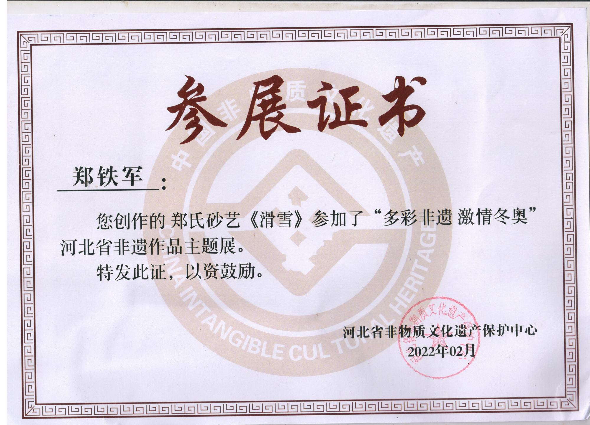 2022年北京冬奧會(huì)是我國重大歷史節(jié)點(diǎn)的重大標(biāo)志性活動(dòng),也是河北省推動(dòng)京津冀協(xié)同發(fā)展、雄安新區(qū)規(guī)劃建設(shè)、冬奧會(huì)籌辦“三件大事”之一。因此省群眾藝術(shù)館(省非遺保護(hù)中心)按照河北省文化和旅游廳的部署在全省開展了“多彩非遺激情冬奧”非遺主題作品征集活動(dòng),本次作品以冬奧文化、冰雪文化、春節(jié)文化為題材,通過藝術(shù)展現(xiàn)冰雪運(yùn)動(dòng),應(yīng)邀鄭氏砂藝執(zhí)行董事國際工藝美術(shù)大師鄭鐵軍創(chuàng)作的砂畫作品《滑雪》、《競技》兩幅作品參展,并被省群眾藝術(shù)館和省非物質(zhì)文化遺產(chǎn)保護(hù)中心永久收藏。