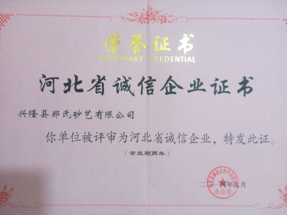 2014年9月26日,鄭氏砂藝有限公司被評為2014年“河北省誠信企業(yè)”,公司的事跡同時錄入《河北省企業(yè)誠信建設成果集》一書中?!昂颖笔≌\信企業(yè)建設交流會”暨“河北省誠信企業(yè)”授牌儀式9月26日在省會石家莊凱旋金悅大酒店舉行,公司總經理鄭鐵軍參加了授牌儀式。鄭鐵軍總經理同時被評為“2014年度河北省企業(yè)誠信建設優(yōu)秀工作者”。
